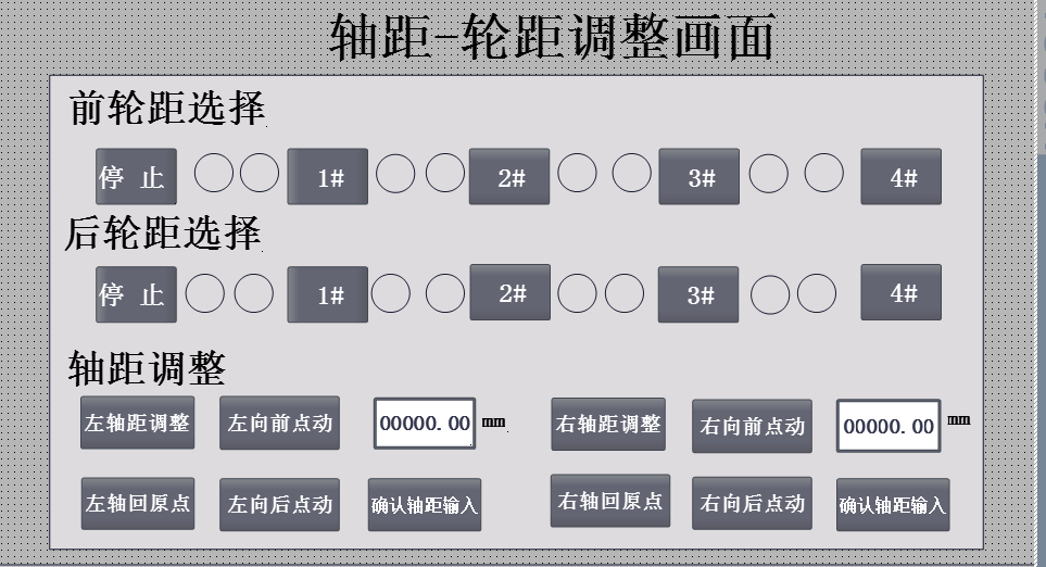 軸距調整采用高精度的伺服電機進行定位,在規定行程內可以靈活進行軸距調整。輪距采用的是氣缸定點定位的方法進行調整,這里有四個輪距可以定義選擇。下圖為觸摸屏軸距輪距調整的界面: